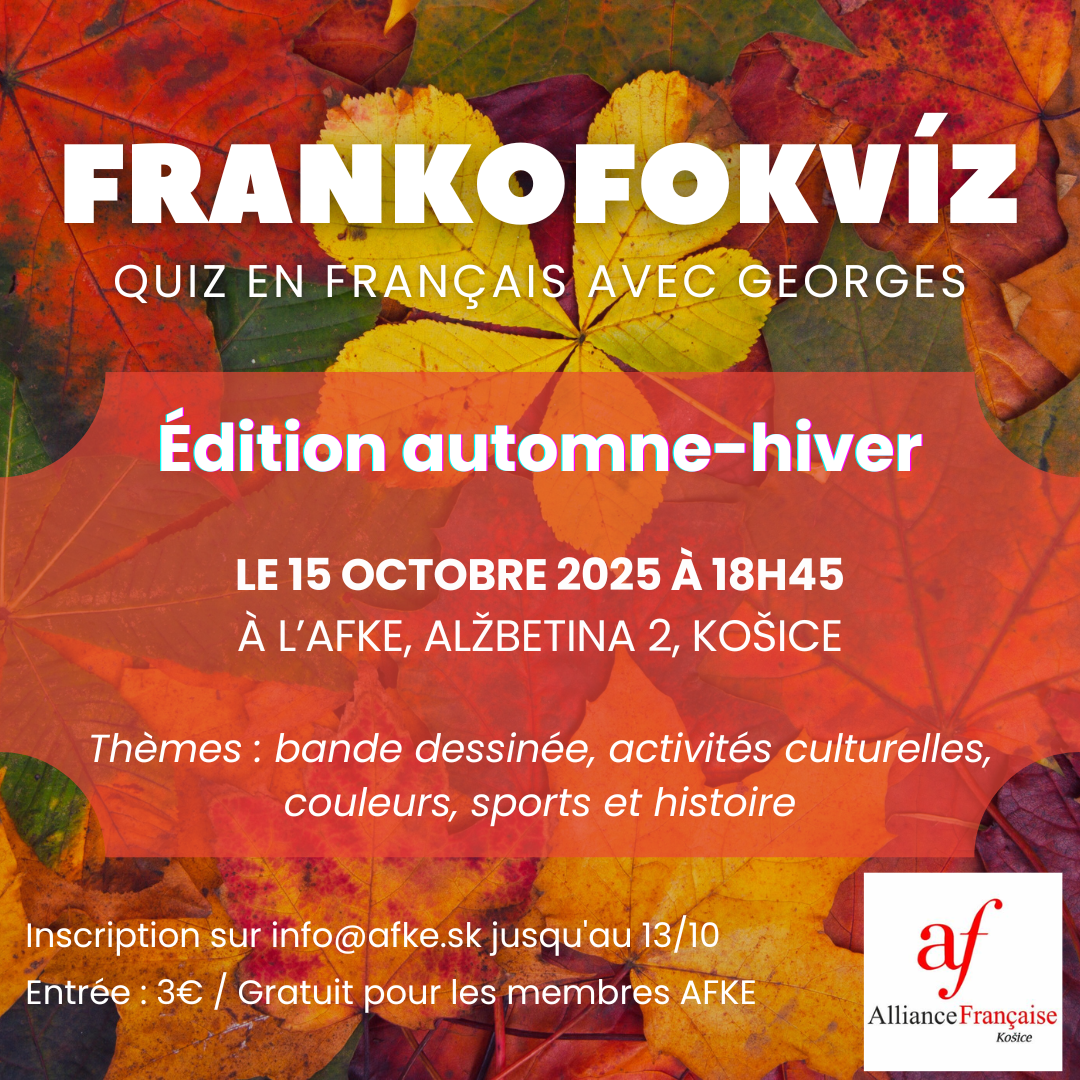 [PROCHAIN FRANKOFOKVÍZ]Rendez-vous le mercredi 15 octobre 2025 à partir de 18h45 pour leFrankofokviz avec Georges !Cette fois-ci, le quiz sera consacré au thème de l’automone et del’hiver.Il est possible de s’inscrire seul ou en équipes.Comme d’habitude, il y aura des petits cadeaux à gagner !Inscription souhaitée au plus tard avant le 13/10 par email àinfo@afke.sk (précisez…