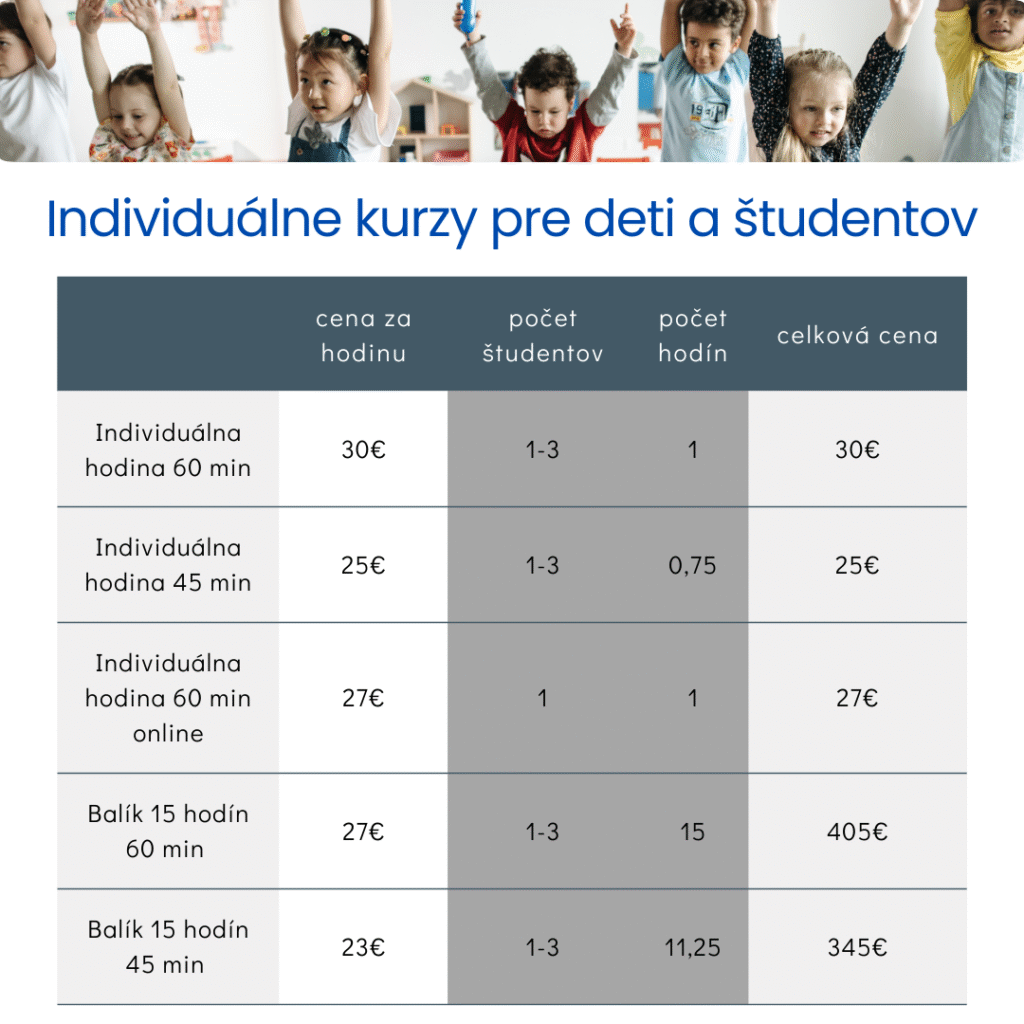 Cena zostáva rovnaká pre kurz zdieľaný 1, 2 alebo 3 osobami.